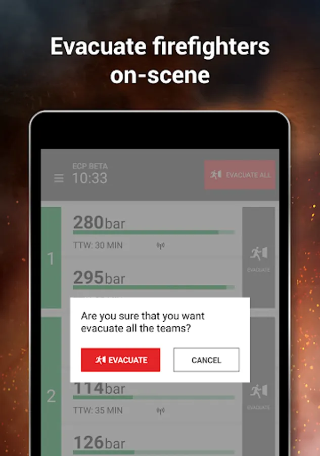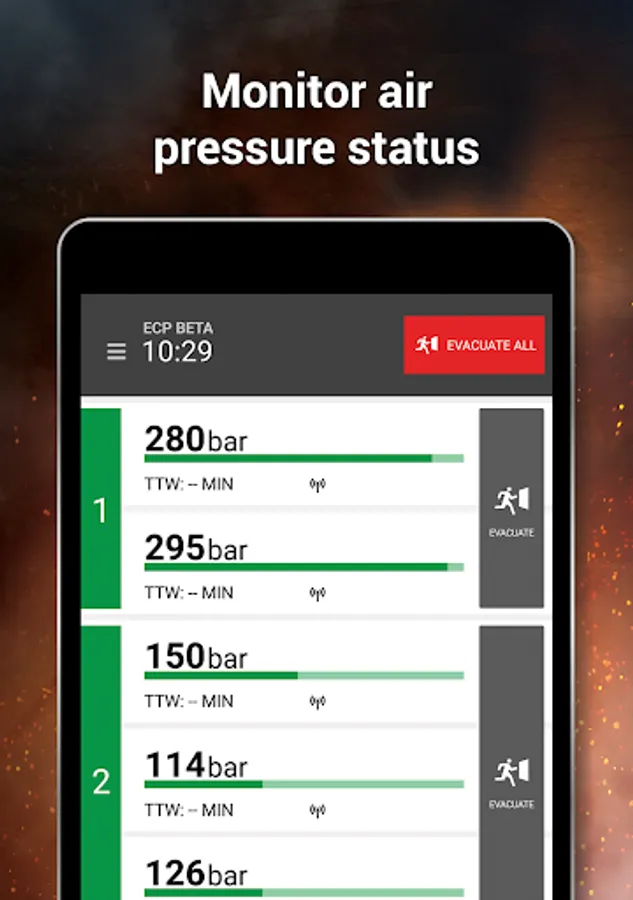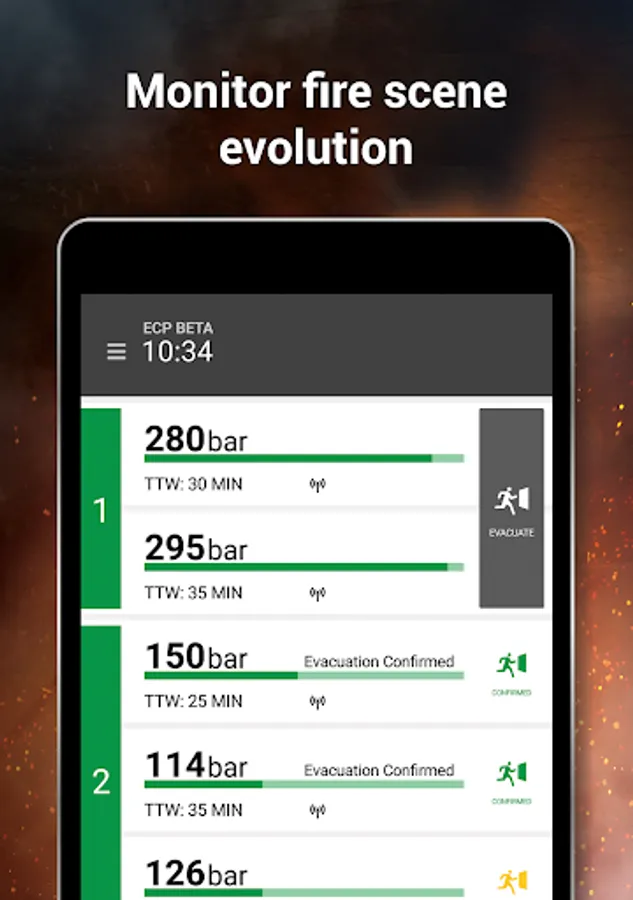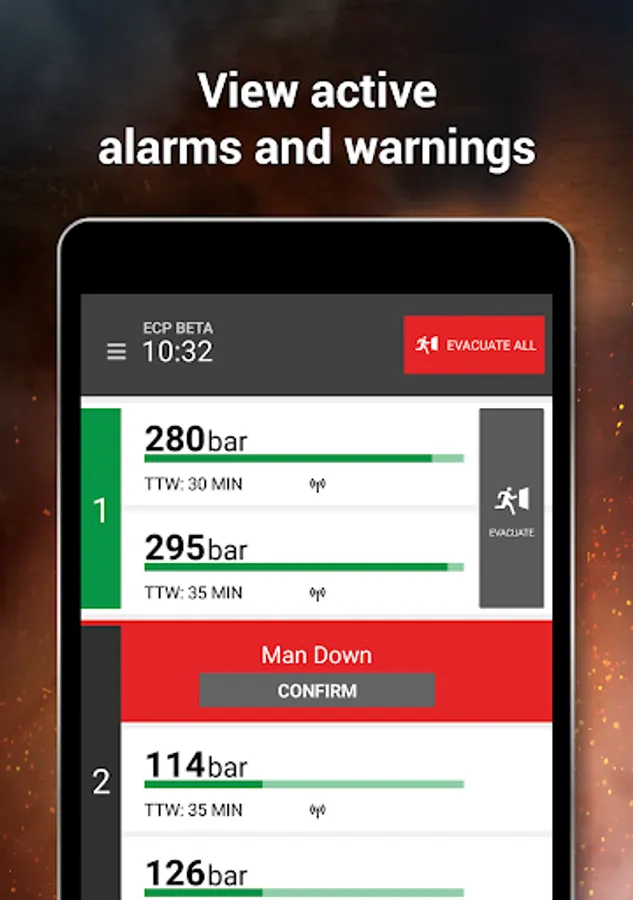 The Safetyio Entry Control Board (ECB) App is part of MSA's respiratory protection monitoring system. The ECB App offers a complete overview on the air and alarm status of telemetry enabled breathing apparatus at a glance. The unique combination of traditional entry control monitoring elements and up-to date technologies increases confidence that Incident Commend is informed and introduces a new level of documentation.