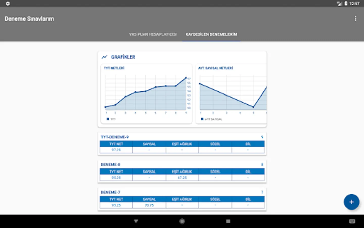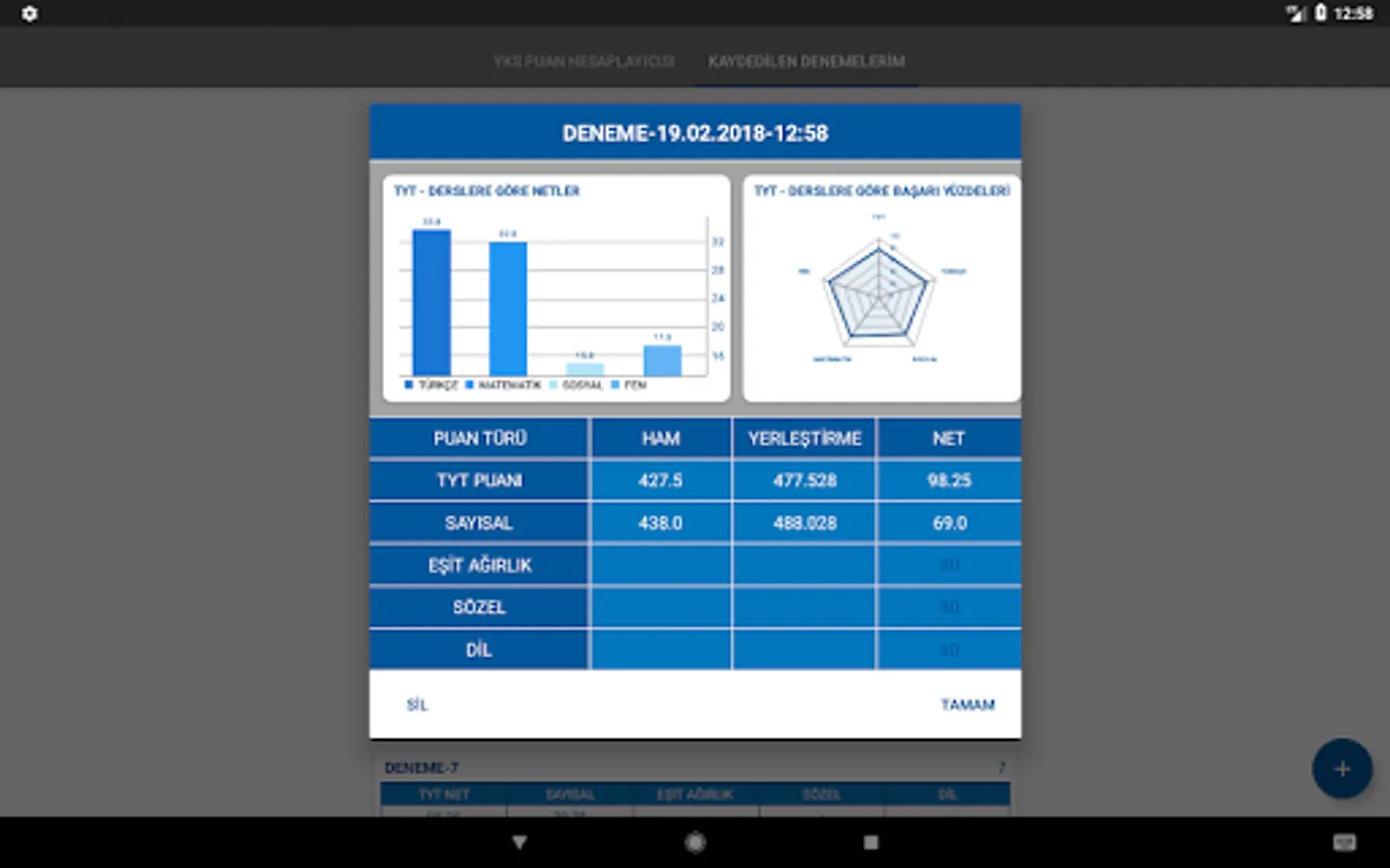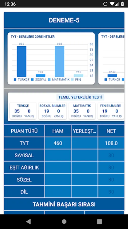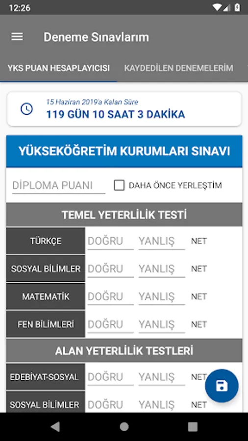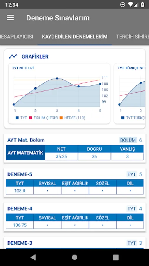In the YKS trials, it was calculated how many points were taken from TYT and AYT (Numerical, Equal Weight, Verbal and Foreign Language) score types and recorded if desired; plots the nets for each score type; a preference wizard that shows details of the sections in universities; simple and convenient application designed by adhering to material design guidelines.