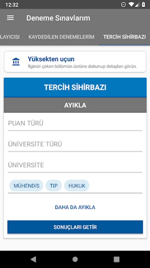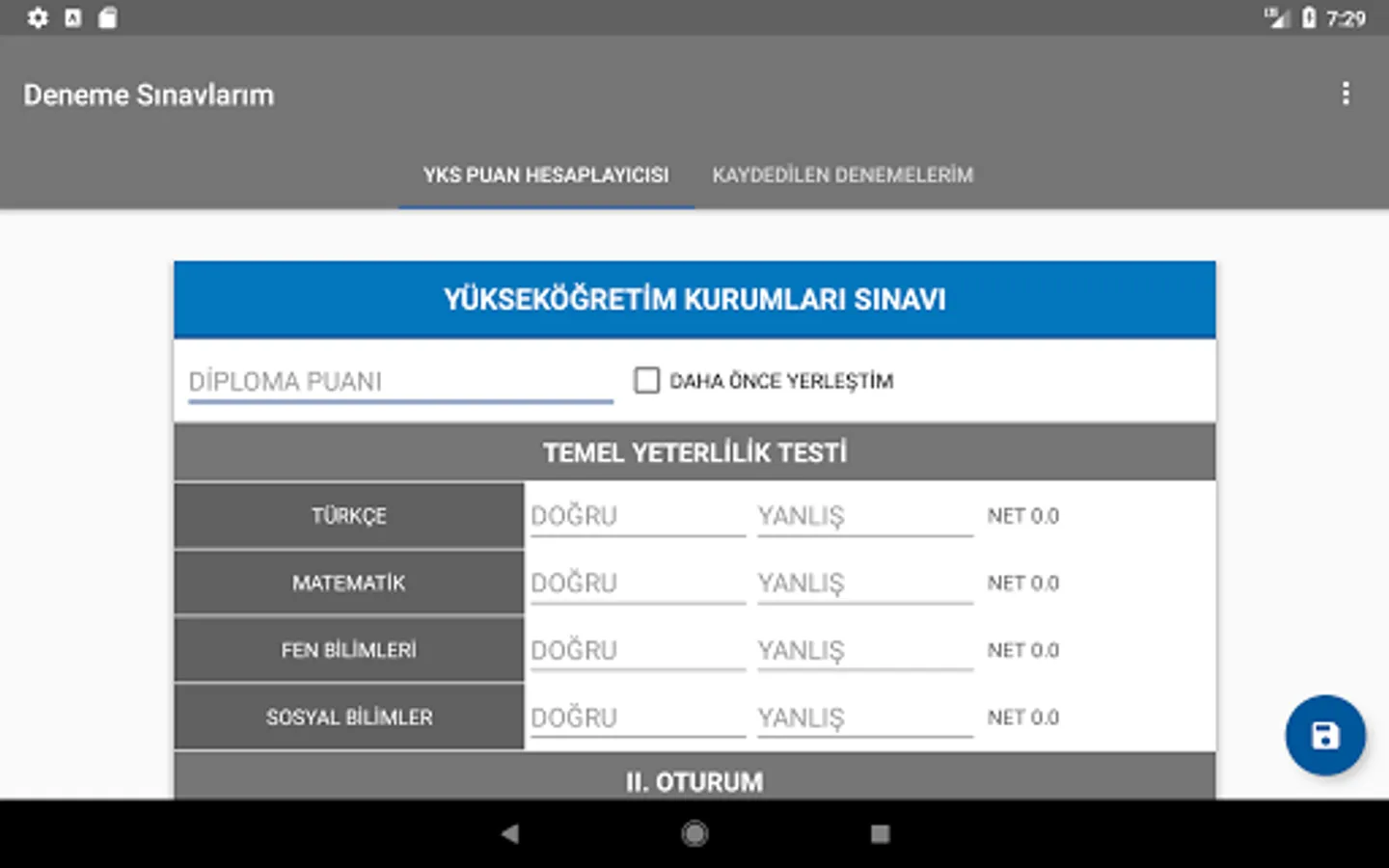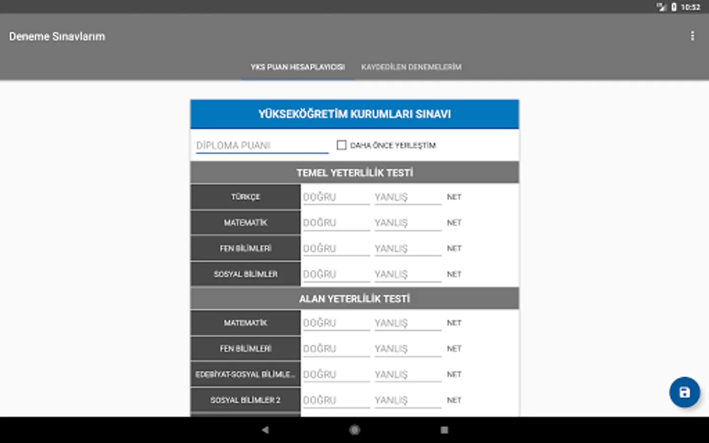 In the YKS trials, it was calculated how many points were taken from TYT and AYT (Numerical, Equal Weight, Verbal and Foreign Language) score types and recorded if desired; plots the nets for each score type; a preference wizard that shows details of the sections in universities; simple and convenient application designed by adhering to material design guidelines.