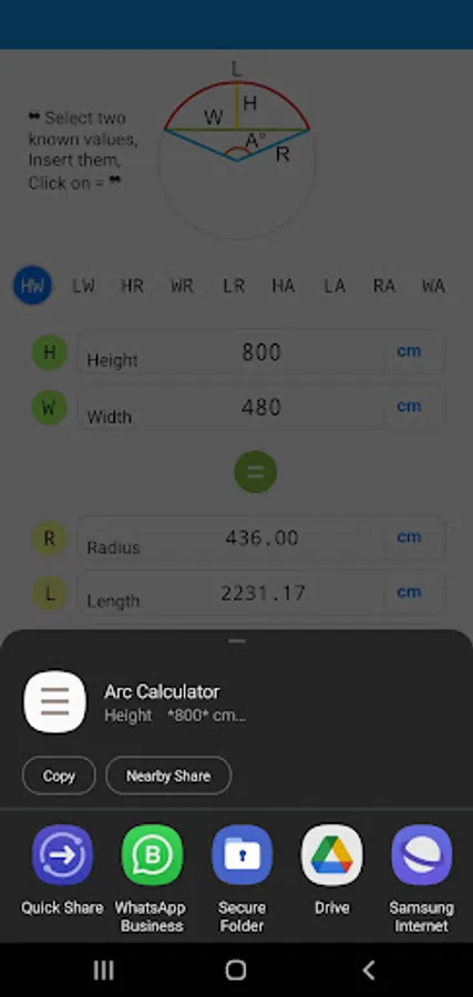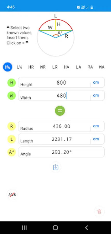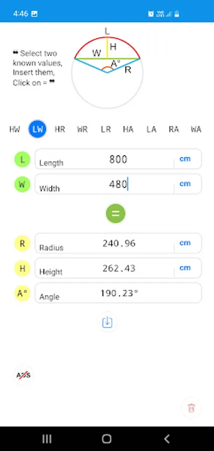 Calculates the Radius, Length, Width (chord) and Height . Please select two known values and type it in text boxes and click on ( = ) to get the required values.