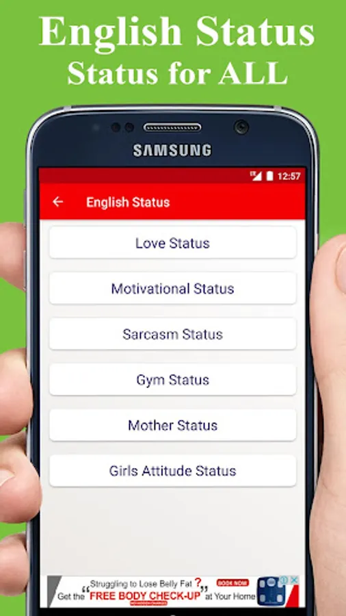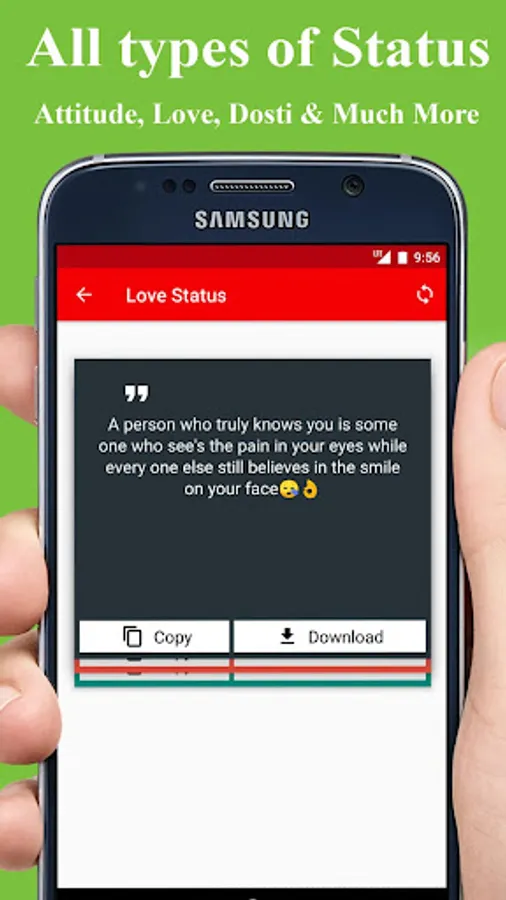 This app brings you the best status collection of 2022 in English & Hindi. Show your attitude & personality with these attitude status in Hindi, Hindi sad status, motivational quotes, love quotes, Dosti status, Hindi funny status, status on life, sarcasm status and more from our collection of best status in English and Hindi. Collection of best status and quotes in Hindi & English which can be used as a WhatsApp status, Facebook status, Instagram captions or on any other social media.