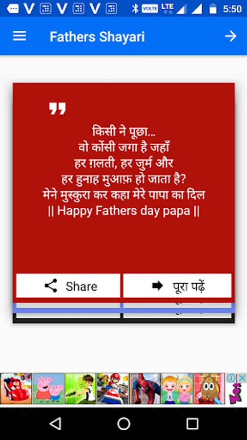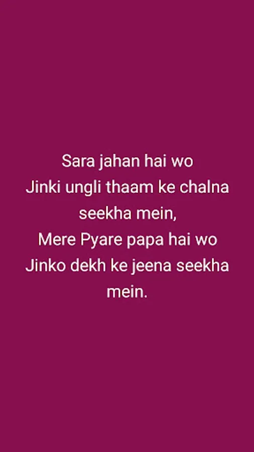 This app brings you the best collection of father’s day shayari in hindi for 2019 with beautiful poem on father in hindi. These shayari on papa can be sent as an SMS to mobile or as a WhatsApp message or it can also be used as a new WhatsApp image status.