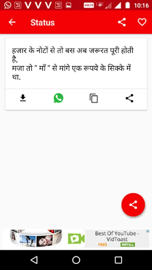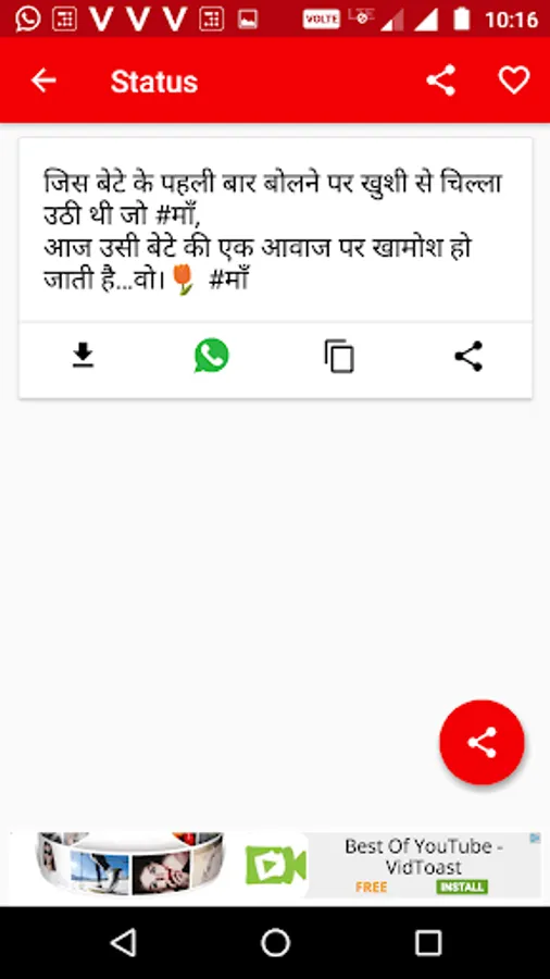 Very easy to use interface just swipe left and right to read the best status for mom in Hindi and easily set that as your WhatsApp status or FB status.