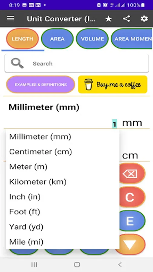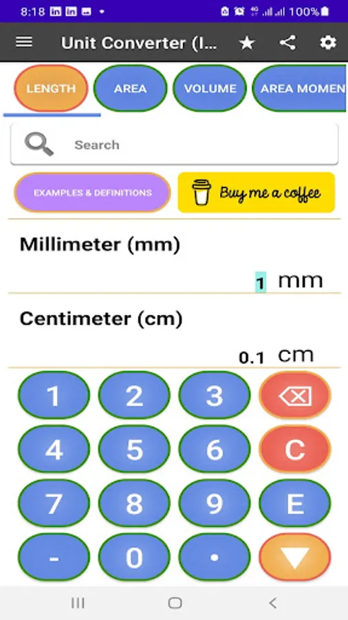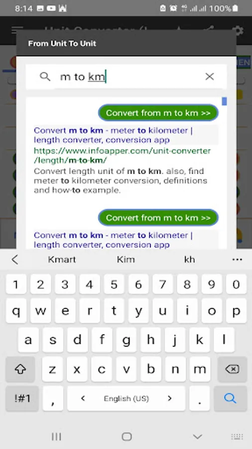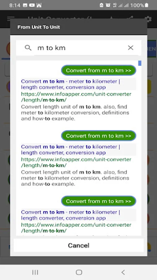 ✔ How to quickly find a from unit to unit conversion: click on upper Search field, a new window will popup, type for example "m to km length" in the upper search field, as you type the results will automaticlly appear with your desired conversion as the first result in a list of all avaliable related conversions, at this stage you will have two options to either click "convert from unit to unit" button to use in the app or click URL link to direct you to infoapper.com for related examples and definitions.