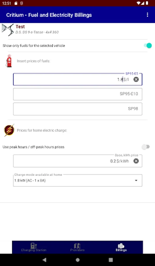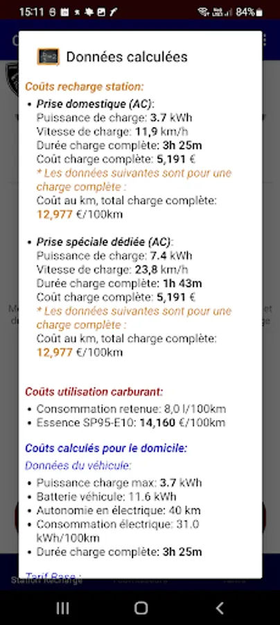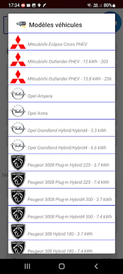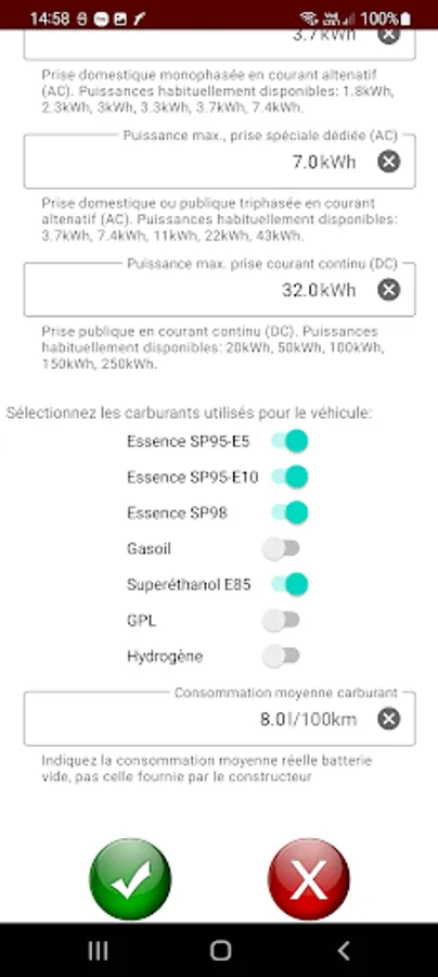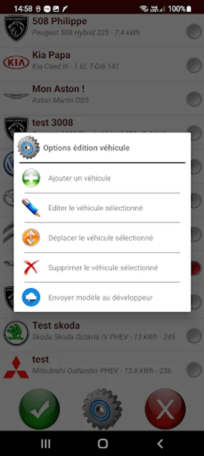 The app lets you keep a list of shortcuts to apps that help you manage charging and fuel costs. Some applications are recognized automatically. You can report others by emailing the developer. Similarly for vehicles, you can send the parameters of unknown vehicles (the electric range must however be that declared by the manufacturer in WLTP mode. The fuel consumption is that once the battery is empty).