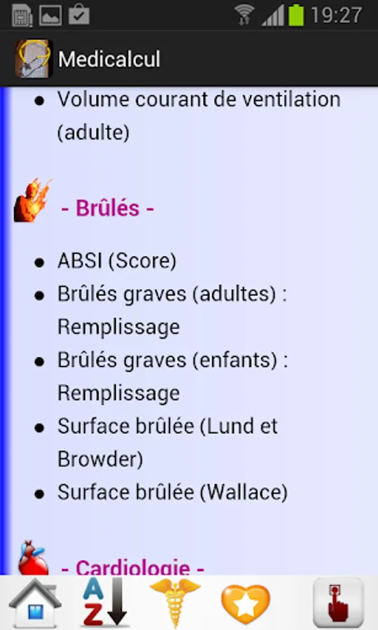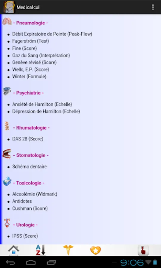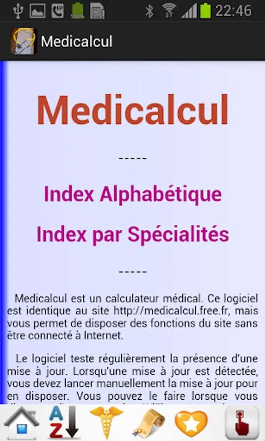 - Medicalcul is a medical calculator allowing to calculate different scores and formulas (creatinine clearance, Apgar score, body surface burned ... you can see the complete list on http://medicalcul.free.fr/_indexalpha.html ). Once installed, the software asks you to update in order to retrieve data from the http://medicalcul.free.fr site. Once this is done, you will be able to use Medicalcul offline, without the need for network access. The software regularly checks for changes and notifies you if an update is available, so that you can re-import files. In order to save your plan data, you can choose to update when you have a WiFi connection.