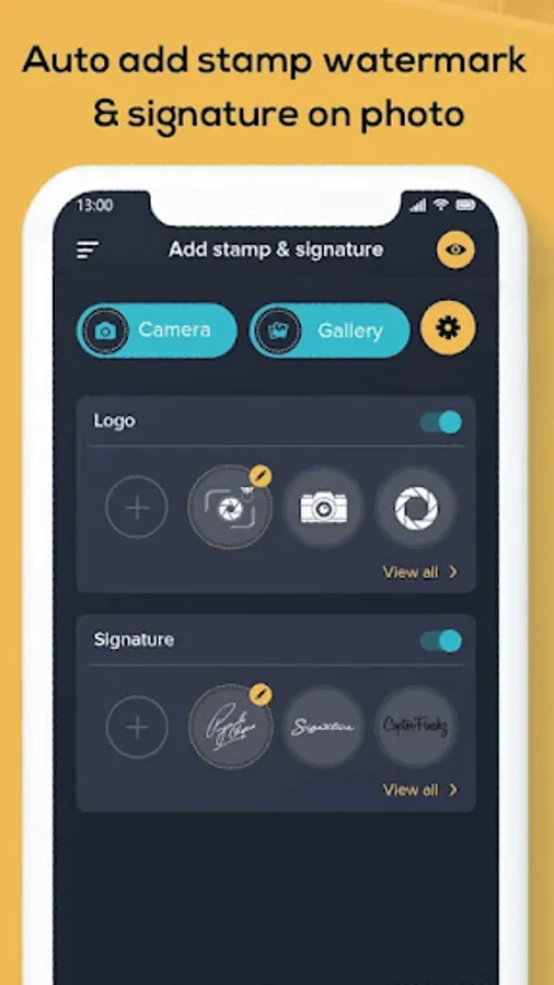 In this app, if you turn on Auto Logo Stamp option, then your logo or signature will be added automatically as you click a photo from your camera.