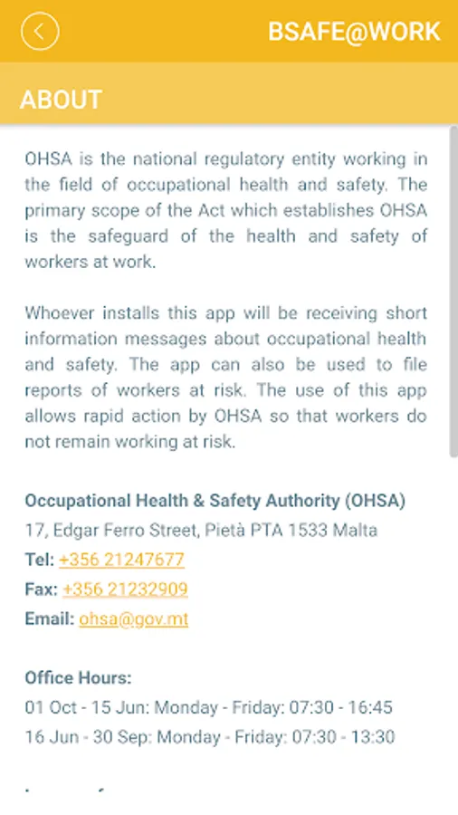 Is-Saħħa u s-Sigurtà fuq il-Post tax-Xogħol għandha d-dmir li tiżgura li l-livelli ta' ħarsien tas-saħħa u s-sigurtà fuq il-post tax-xogħol jinżammu, kif stipulat mil-liġi. Dan il-proġett se jgħin lill-OHSA fl-operazzjonijiet tiegħu billi jipprovdi lill-pubbliku ġenerali metodu aktar faċli biex jissottometti rapporti u/jew ilmenti, kif ukoll jinnotifika lill-utenti bl-aħħar informazzjoni.