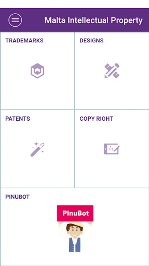 App li tipprovdi assistenza lil individwi u entitajiet interessati fil-qasam tal-Propjetà Intellettwali. Din l-app tipprommwovi n-numru vast ta’ servizzi offruti mid-Direttorat tal-Propjetà Industrijali fid-Dipartiment tal-Kummerċ