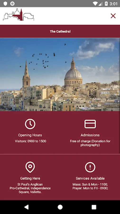 The Cathedral was commissioned by Queen Adelaide during a visit to Malta in the 19th Century when she found out that there was no place of Anglican worship on the island. Prior to this Anglican services were held in a room in the Grand Master’s Palace. Built on the site of the Auberge d’Allemagne, the cathedral was designed by William Scamp and was built between 1839 and 1844. Queen Adelaide laid the foundation stone on 20 March 1839 and her banner hangs above the choir stalls. The original plans were designed by Richard Lankasheer however the building proved unstable thus work had to resume on plans by Scamp in 1841. Scamp’s designs located the altar on the west side of the church however the Bishop of Gibraltar had a more conservative view, thus the designs were altered and Scamp designed an apse inside the great doors to hold the sanctuary on the east side.
