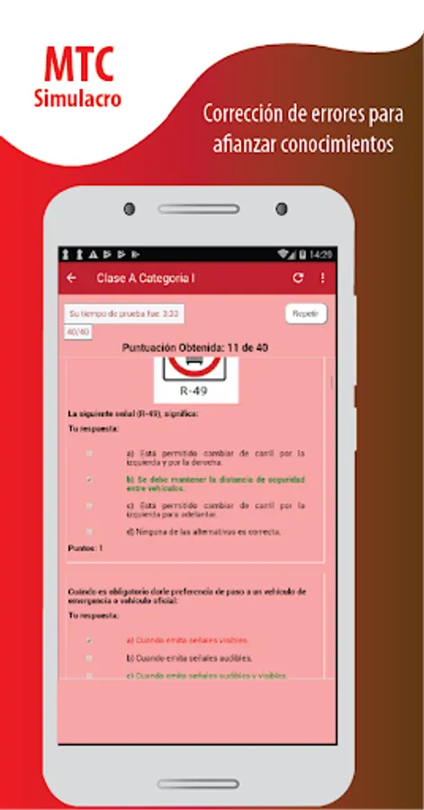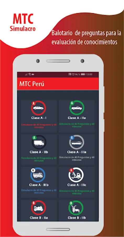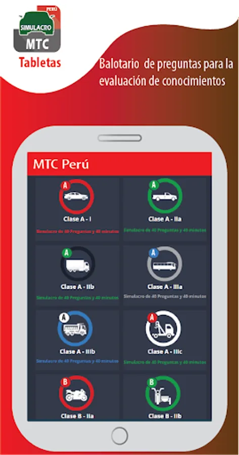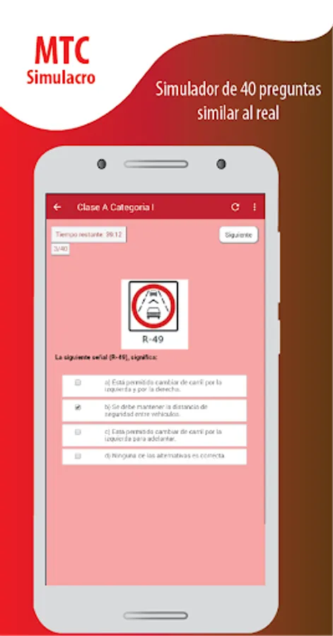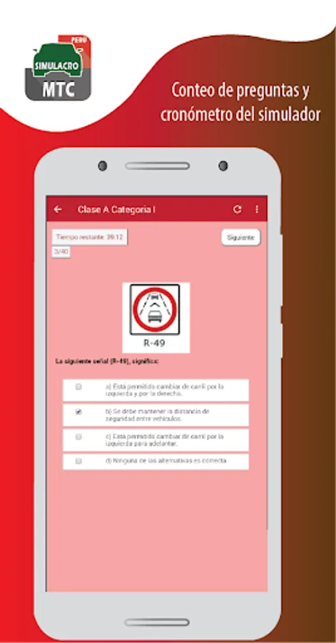 The best of success in your exam to obtain the license in the mtc Ministry of transport and communications of Peru, review and practice as many times as necessary, you only need the Internet to simulate.