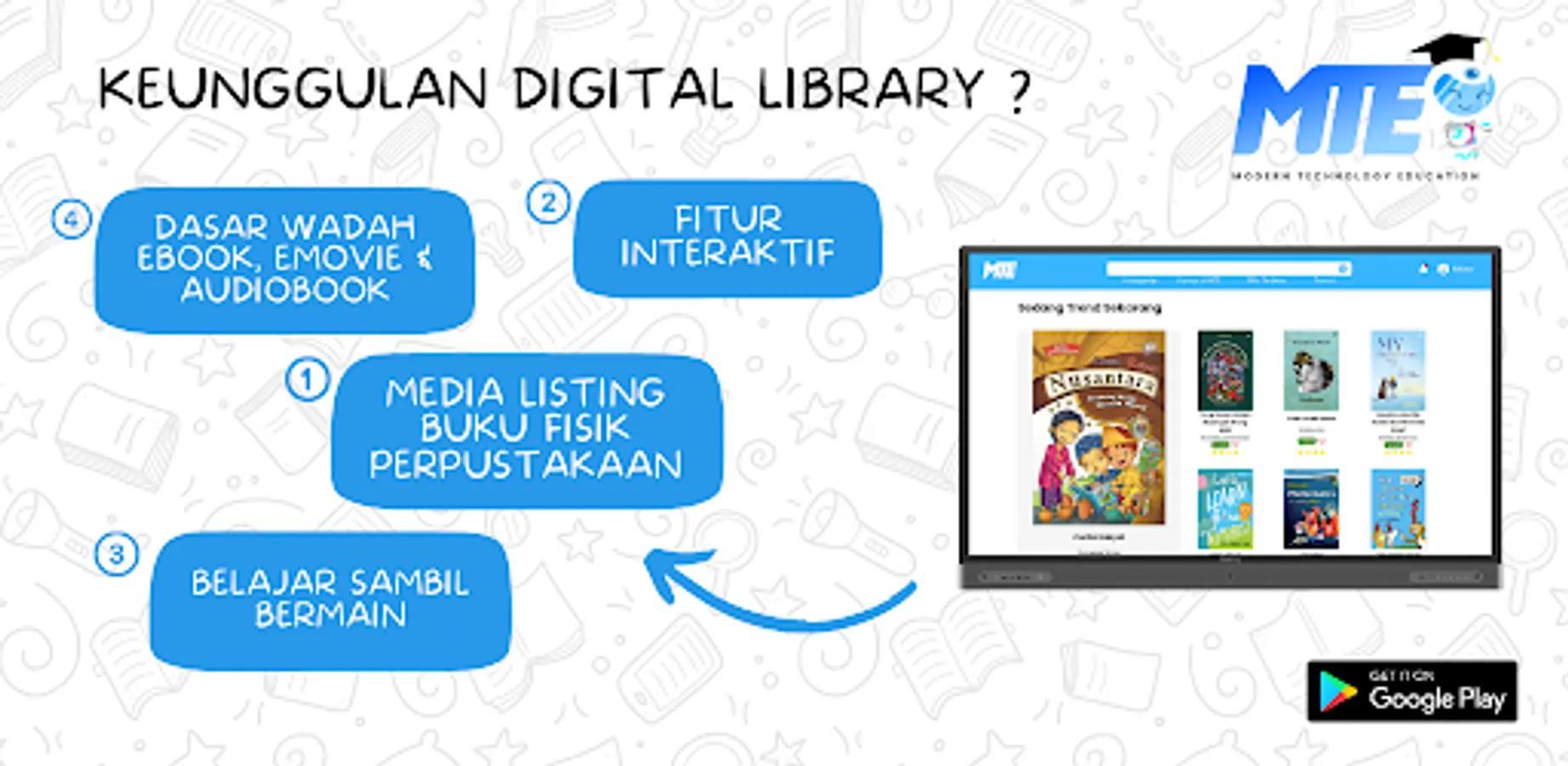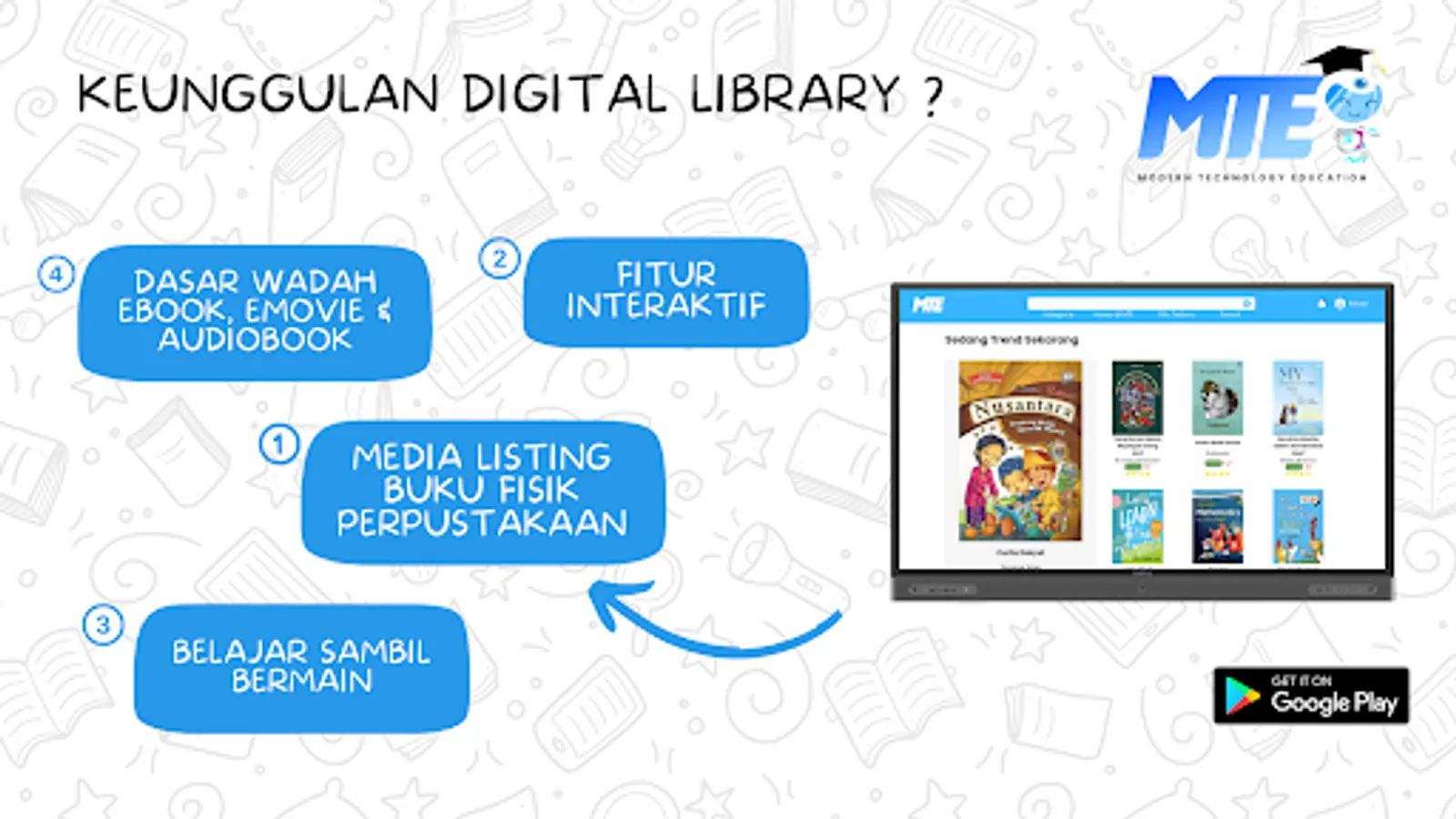 In order to strengthen literacy in schools, it certainly requires supporting products. MTE offers a variety of excellent products that can be used by teachers, students and schools so that literacy can support educational activities. Multifunctional MTE E-Library as Smart Classroom, Artwork Media, Online Meeting