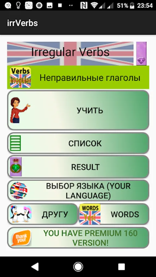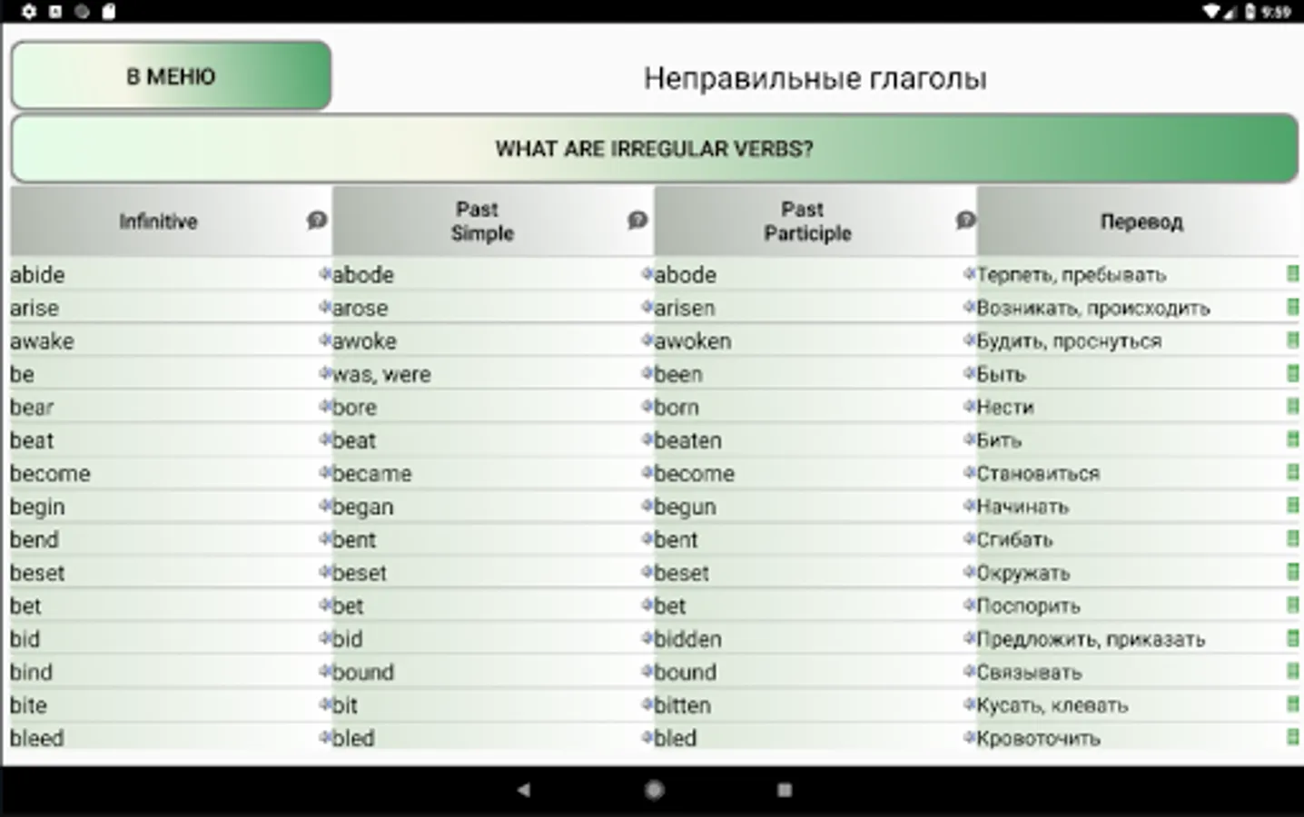 The app is free, but if you like it and will be useful for a nominal amount you can download a version without ads. By the way, passing through all 8 groups, your knowledge of irregular verbs. will be better than that of a graduate special school with the English language. And it will require a couple of hours and a few approaches. Academic success!
