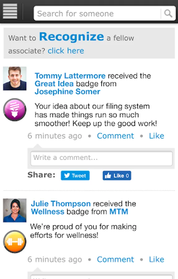 All users can quickly and easily send recognition to a co-worker, view all the recognition you've earned, send e-cards, view co-worker's recognition, check out upcoming anniversaries and birthdays, and even share recognition via Facebook, Twitter and more!