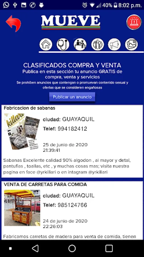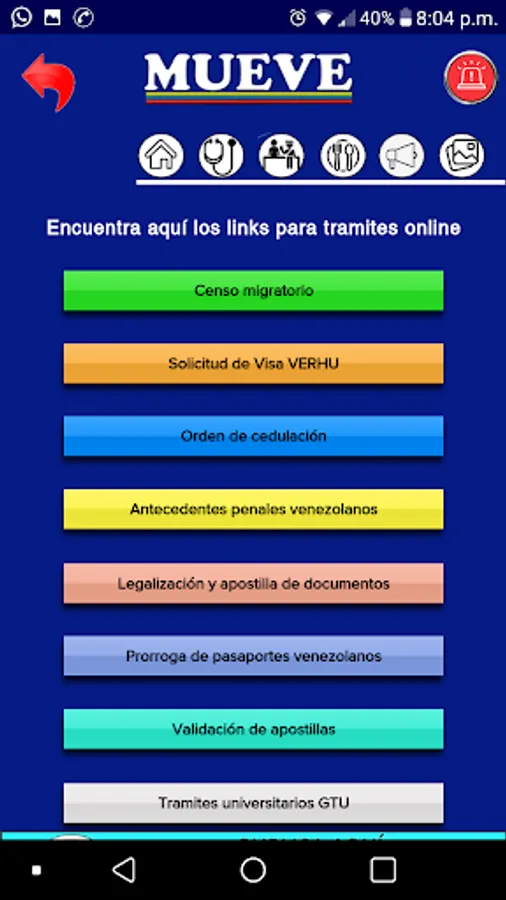 MUEVE App is designed to support the Venezuelan migrant community based in Ecuador and expose the best ventures. Within the App you can find the following: List of public and private health centers nationwide, Venezuelan clinics and health centers, directory of public institutions and NGOs, Main news portals of Ecuador and Venezuela, Ecuadorian laws in PDF and requirements for legalization procedures, main Venezuelan restaurants, business premises of Venezuelan entrepreneurs, Classifieds for the sale of products and services, job offers and demands, transport and delivery services, events, tourist reviews of Venezuela and curiosities, tourism in Ecuador, information gallery , radio, complaints, solidarity classifieds, information to the migrant, basic education books of the Ecuadorian public system, Venezuelan artists, links for online legalization procedures. Be sure to download it and stay informed in addition to promoting your venture throughout Ecuador.