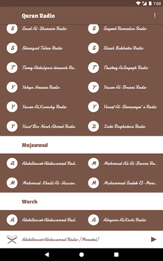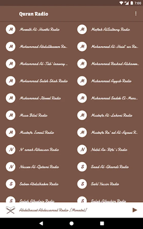 يوفر هذا البرنامج اذاعات القران الكريم للإستماع علي مدار اليوم وهي :