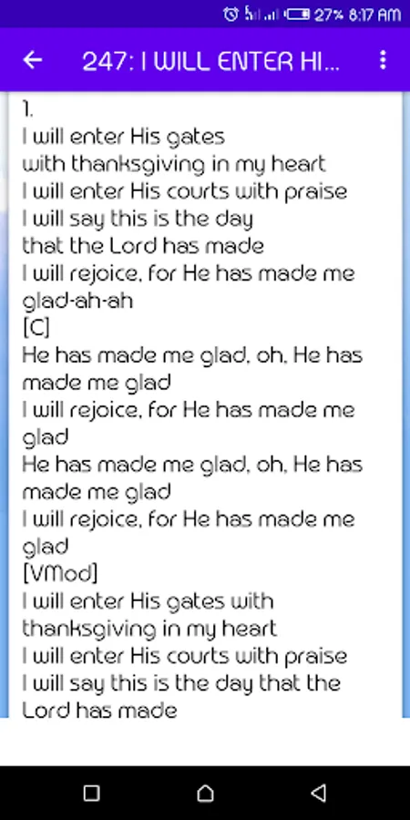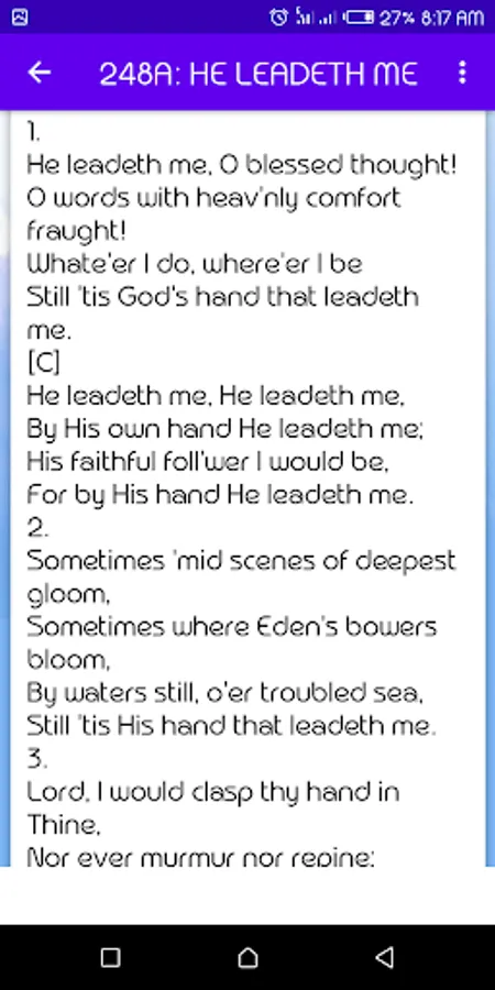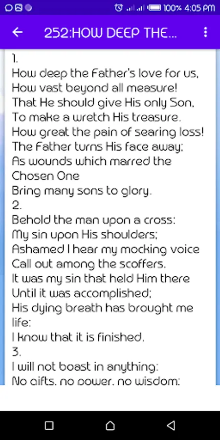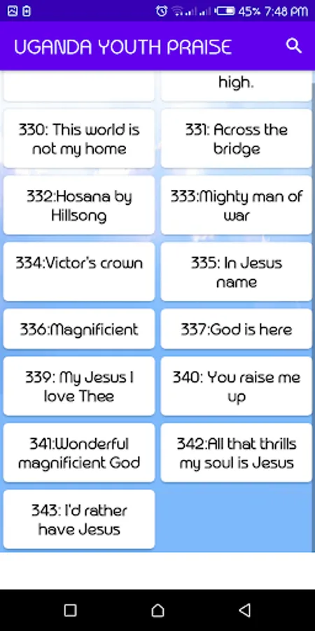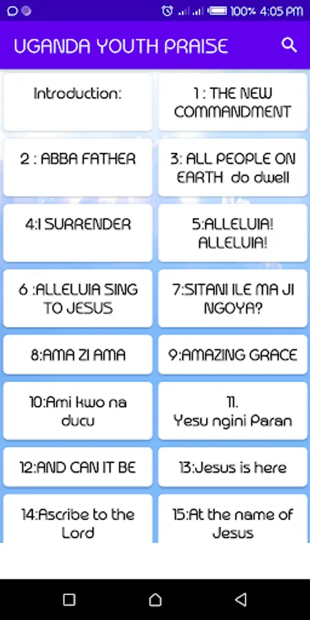 Mobile app that consists of hymns of Praise and worship.Cool interface easy to use.Grid view layout. U cant miss this. Search feature enabled