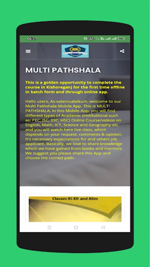 Hello users, As-salamualaikum. welcome to our Multi Pathshala Mobile App. This is MULTI PATHSHALA. In this Mobile App, you will find different types of Academic (institutional such as: PEC, JSC, SSC, HSC) Online Course/videos on English, Math, ICT, Science and Geography etc and you will watch here live class, which depends on your request, comments & opinion. It's necessary expectations for and others job applicant. Basically, we love to share knowledge which we have gained from books and mentors. We suggest you please share this App and choose the correct path.