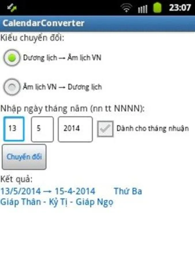 - Feature of converter: convert date from Gregorian Calendar to Lunar Calendar and vice versa Vietnamese