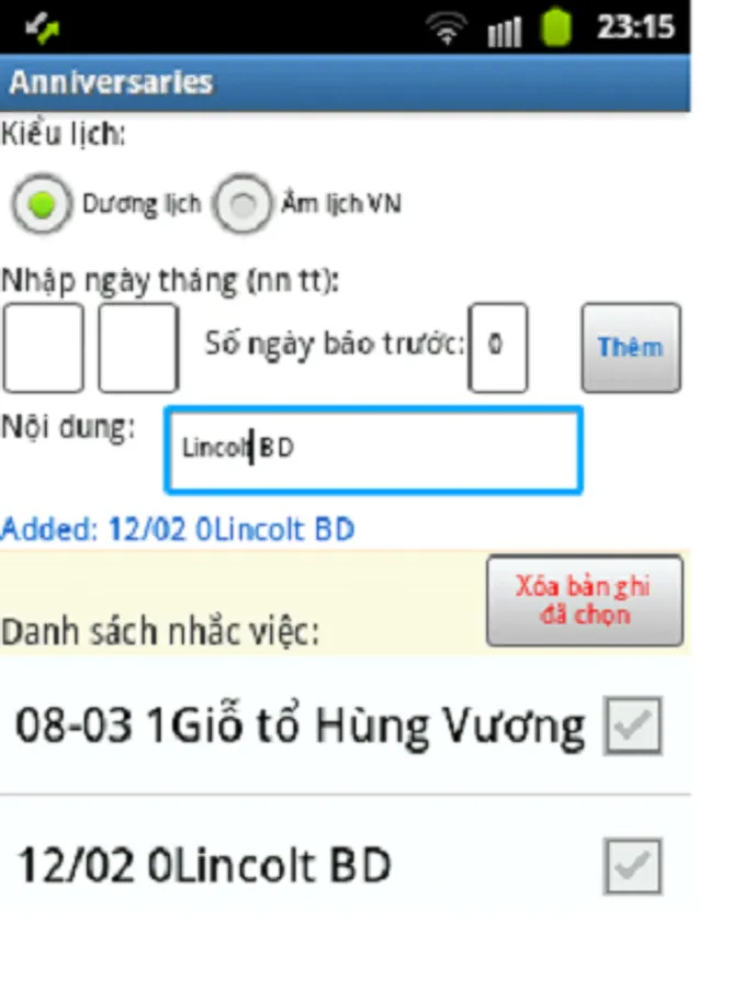 - Special feature: Notification for Anniversary setted in your own database by Vietnamese Lunar Calendar (Gregorian Calendar of course by as well) continuosly maximum 9 days is before the date. The database can be edited Easily