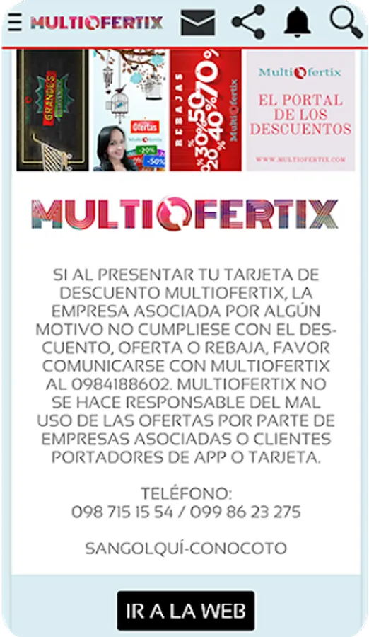 MultiOfertix is a young company that was born with the purpose of helping local businesses in Valle de los Chillos and its province, promoting it through the use of Technology, Social Media Marketing and Digital Marketing. And offer citizens of both the Valley and anyone visiting our city, a business directory for any need they have, creating a synergy between people and businesses. We offer all companies a multi-channel solution designed to attract customers, our intention is to support their business, bringing new customers through our partners, as well as loyalty to the existing one, with an advertising strategy in which they align offline and online techniques. And for people, the possibility of, if you have the App or the membership card, obtain the offers, gifts, discounts, etc. offered by the companies included in our platform.