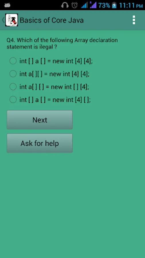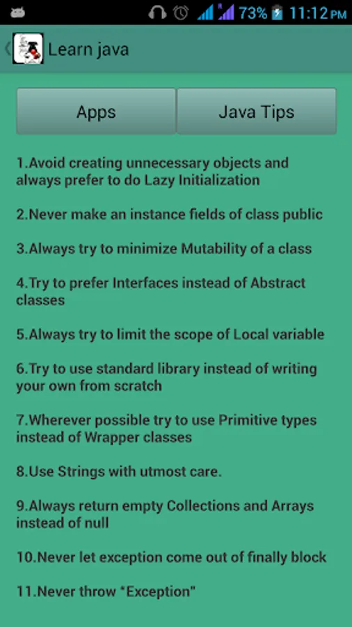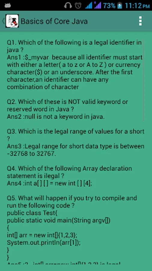 Questions have a very good standard. This app allows to to really test and challenge your java skills. If you think you are a java expert then this app is for you to show the world that you are an expert.
