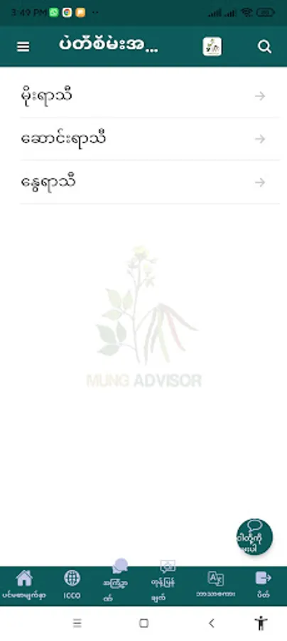 The application is originally based on the Mung Advisor app developed by ICAR-Indian Institute of Pulses Research (IIPR). This is a bilingual App in English and Burmese and provides season-specific guidance of improved varieties, cultural practices, crop management, pests and diseases & their management, post-harvest technology, and marketing in Myanmar. Efforts are done by WorldVeg in collaboration with DAR to develop a Burmese version of the App with details including varieties relevant for Myanmar farmers and climatic conditions.