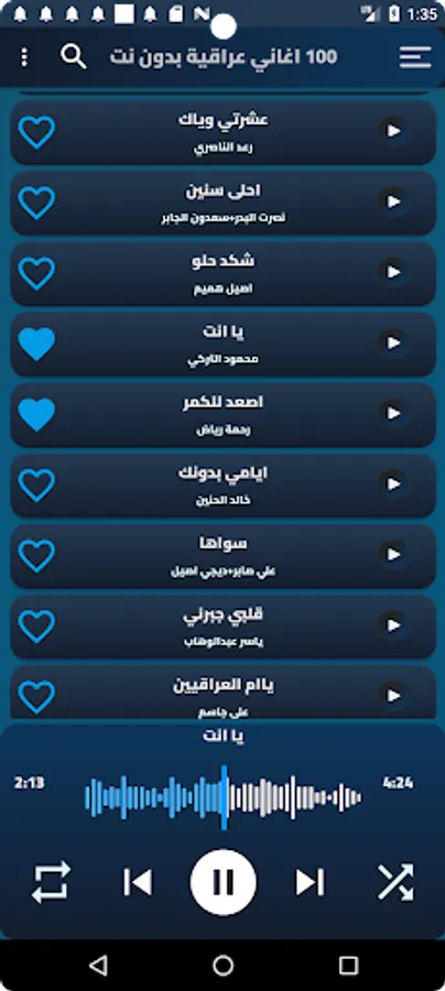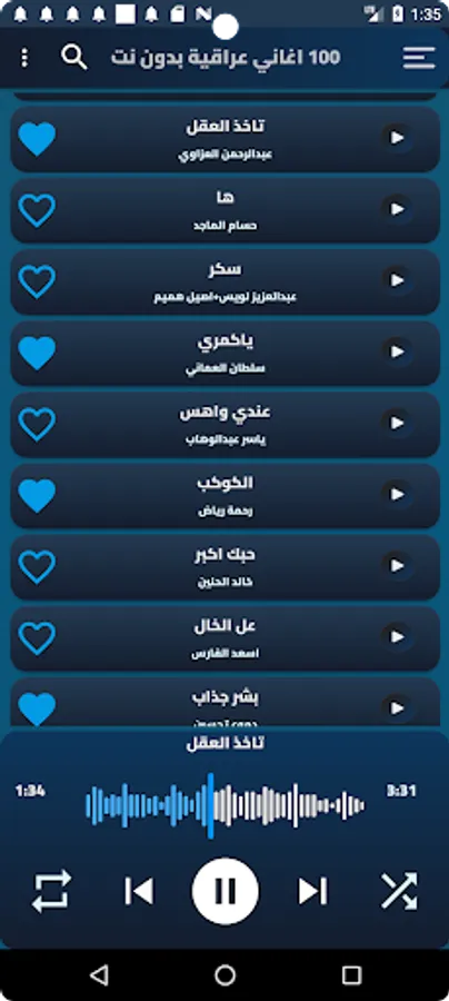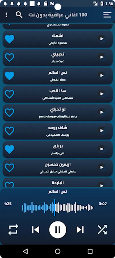 In the application, you will find many features where you can add your favorite Iraqi songs to your favorite list. You can also move between songs with ease. You will find that the application is also distinguished by the feature of stopping the song in the event of a call on the phone. You will find in the application a lot of Iraqi songs without the net, as the application contains On new Iraqi songs 2023, and also in the application you will find old Iraqi songs. These songs were chosen according to the taste of the users