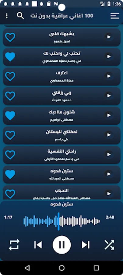 In the application you will find a lot of distinguished Iraqi artists such as the artist Saif Nabil. You will also find the songs of Rahma Riyad without the net. You will find famous artists and the songs of Nour Al-Zein, as well as the distinguished artist Yasser Abdel Wahhab, and also the star Mahmoud Al-Turki and Ali Jassim, also the songs of the artist Sultan Al-Omani, and you will find tears of improvement, the composer and the artist Ali Saber and the distinguished artists Raad, Mithaq Al-Samarrai and Ahmed Sattar. Also in the application, you can listen to the artist Mahmoud Al-Ghiath and Saif Amer.