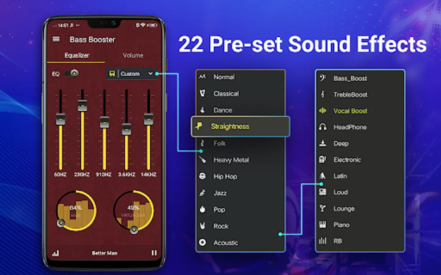 Music Equalizer with the best five band Equalizer, Bass Boost and Virtualizer effects. Equalizer Pro lets you adjust the sound effect levels so you can get the better out of your music. FREE download this fantastic Music Equalizer and get better musical enjoyment!🎧🎶