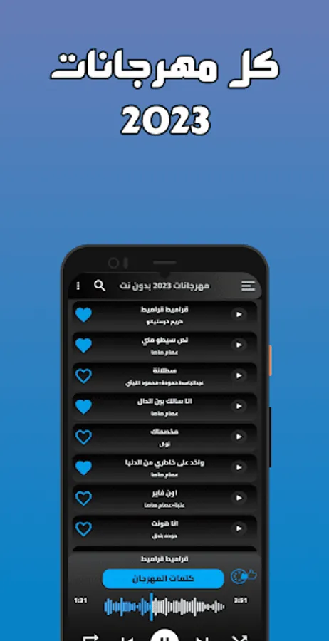 All the contents of the 2023 festivals application, as it contains all 2022 festivals without the net. In the application, you will find festivals of many famous artists, such as Karim Cristiano 2023 festivals without the net, and Issam Sasa festivals 2023. Also, Mahmoud Al-Laithi festivals 2023 and Abdel Basset Hammouda festivals 2023. You will also find Houda Bunduq festivals 2023, as well Hassan Shakush Festivals 2023, Muslim Festivals 2023, Hamada Al-Asmar Festivals 2023, Hamo Al-Tikha Festivals 2023 without the net, Seif Magdy and Omar Al-Karawan Festivals, Ahmed Moza Festivals 2023, Richa Costa Festivals, Samara Now, and many artists of the latest 2023 Festivals, as well as the 2022 Festivals without Internet