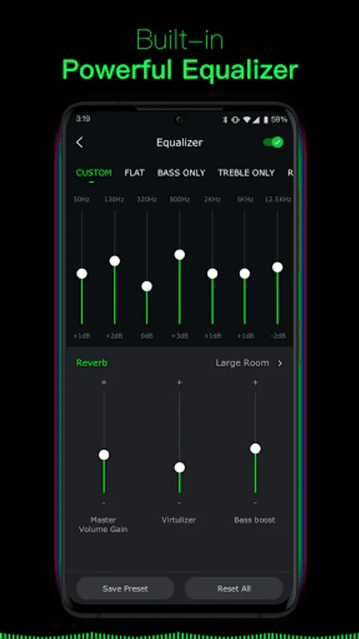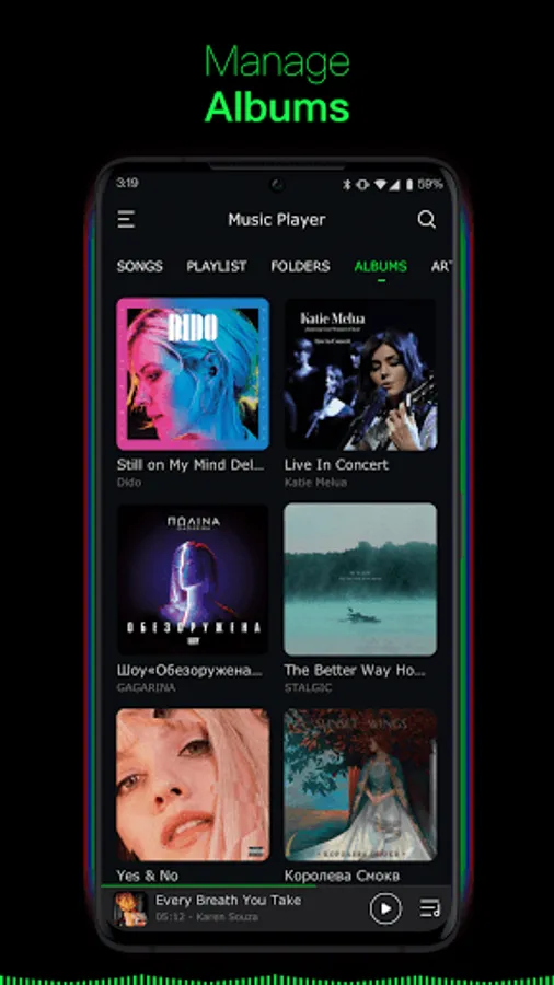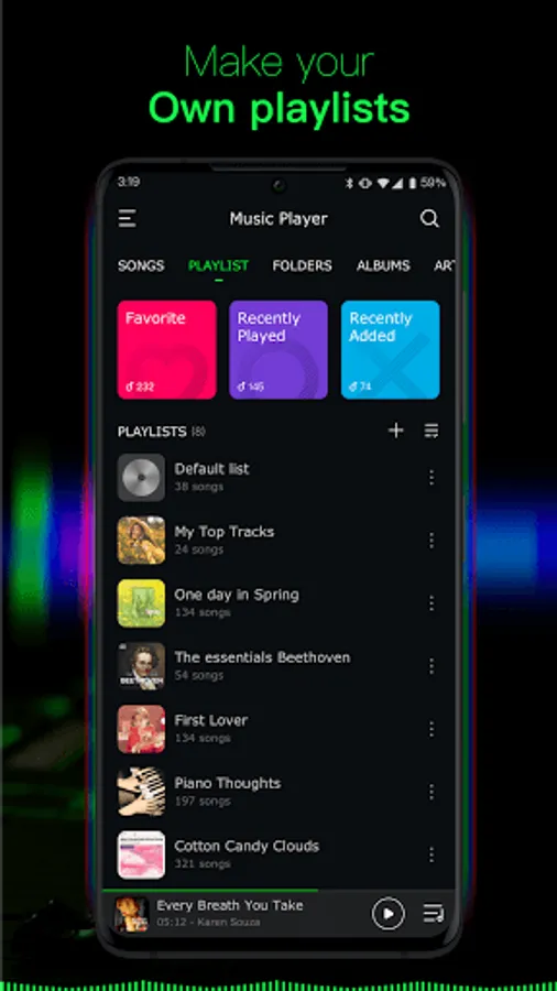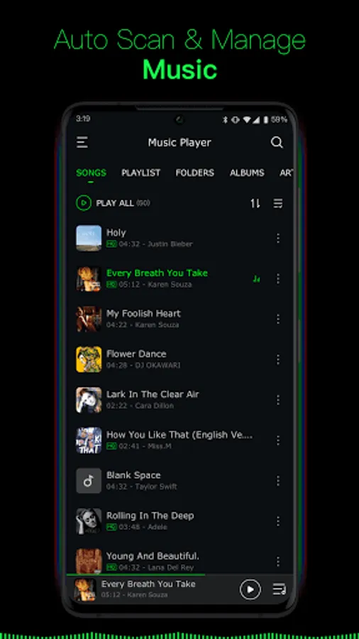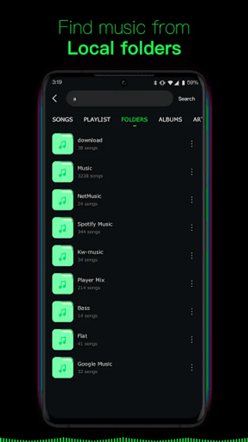 1. Browse songs in 6 different ways (Playlist, Genre, folder, Artist, Album and songs).