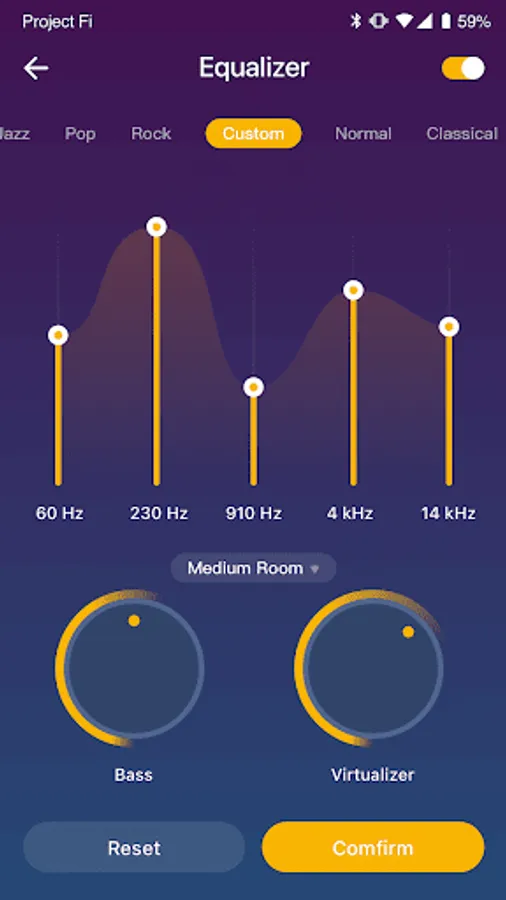 β 5-band equalizer with powerful bass and virtualizer with reverb settings.