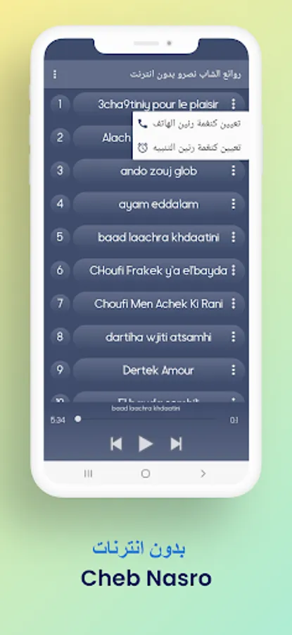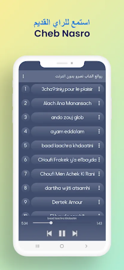 Enjoy a large variety of songs wherever you are with the application of Cheb Nasro's masterpieces without the Internet! Download our application now from the Google Play Store and get access to the best songs of Cheb Nasro, with exceptional quality and periodic updates. Create playlists