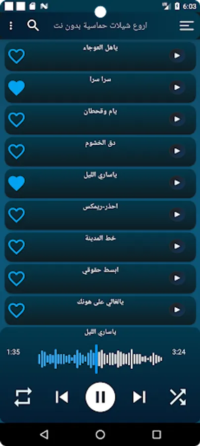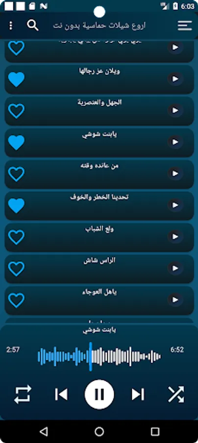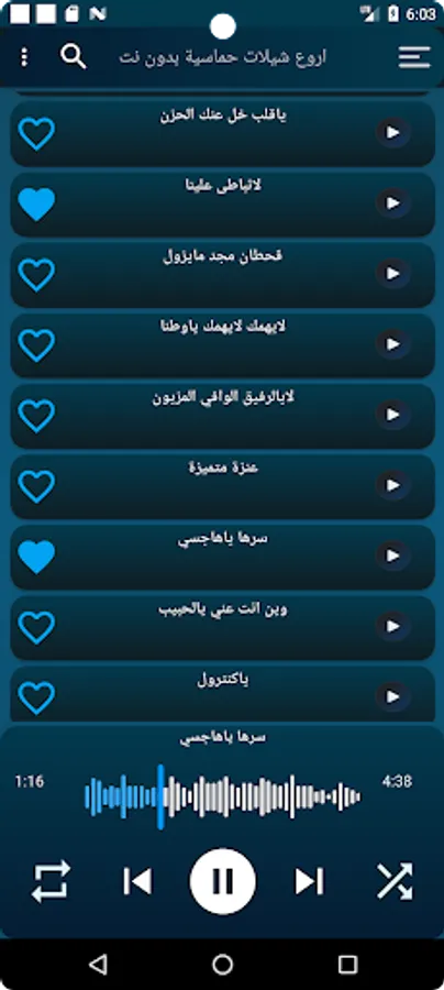 The application also contains enthusiastic chelated songs without the Internet, for vocalists such as Muhammad bin Gharman and Ghazai bin Sahab, and you will also find Khaled Al-Sheliya, Muhannad Al-Otaibi and many vocalists for enthusiastic chelators, as the application is all chelated without the net