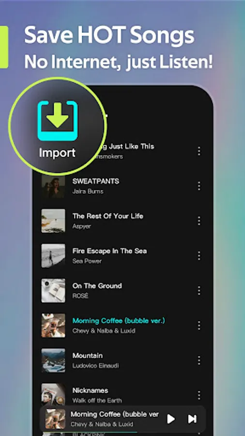 - Music import, you can import any music or video you want from Photos, Files, Wifi, and you can listen to it offline.