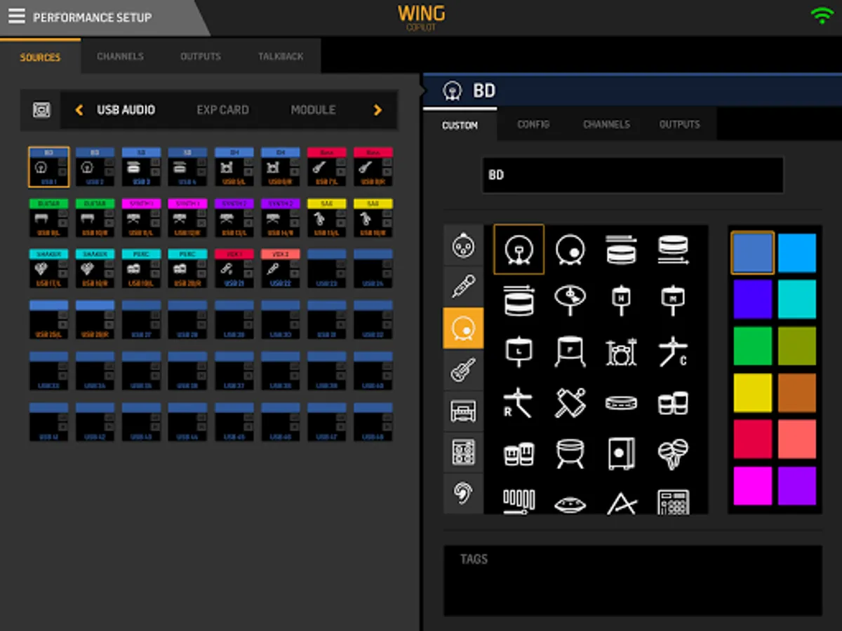 This section is especially tailored to the activities during setup and line-check. Prepare all Sources and Outputs while patching signals to I/O boxes on stage. Sources can be named, tagged, given a color or an icon. Sources also own the head-amp properties such as gain or phantom power.