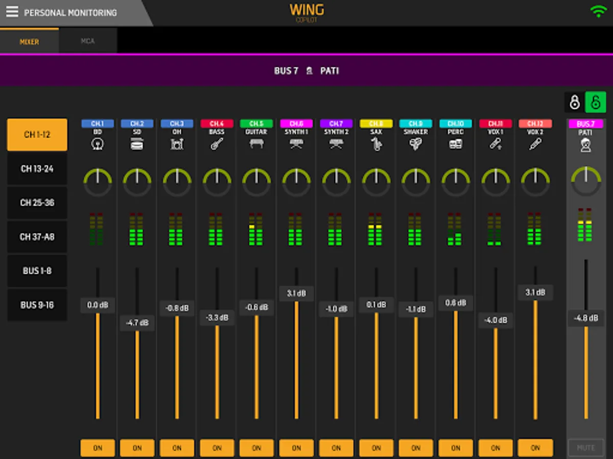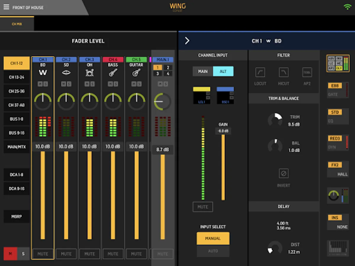WING CoPilot offers valuable control in different types of live or studio work, when the audio engineer is remote from the console or when tasks are split with techs on stage. It offers specific user interface modes for Performance Setup and patching, Personal Monitoring, Metering overviews as well as full SD Recorder control. The Front of House mode provides full remote access to channel processing and mixing, and it now features full graphics UI for all plugin and insert effects.
