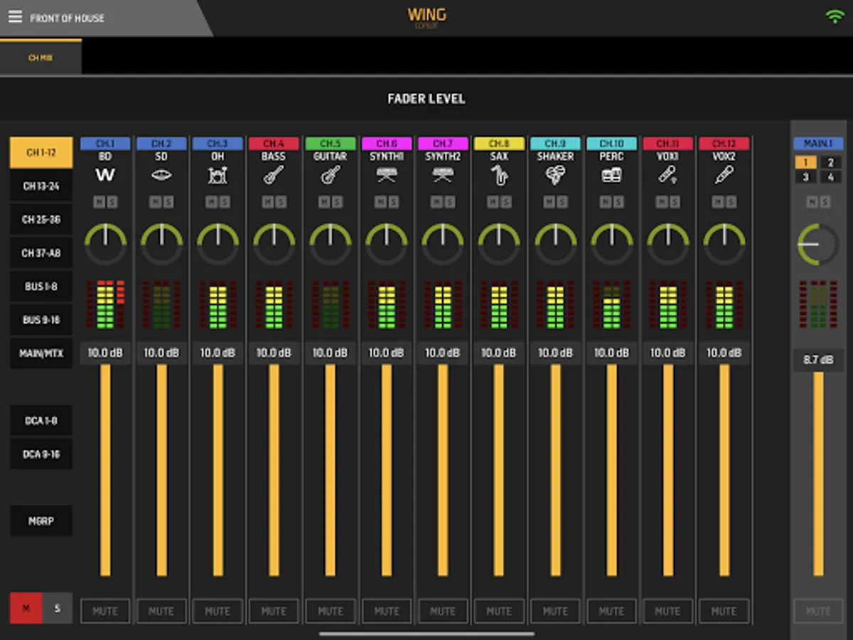 Up to 4 MCAs can be given a descriptive name for the associated group of channels, and a color can be selected for additional clarity. Once the channel assignments are made, the MCA sliders can be used to increase or decrease the level of all associated channels at once.