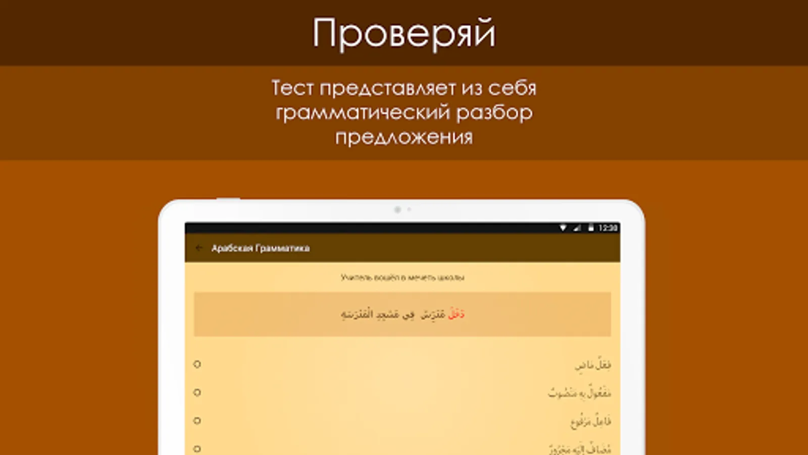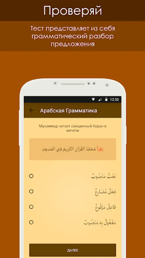 The tests represent a proposal for Russian and Arabic. Words in a sentence in Arabic, in turn, highlighted in red, after which the user must choose what part of speech the word belongs.