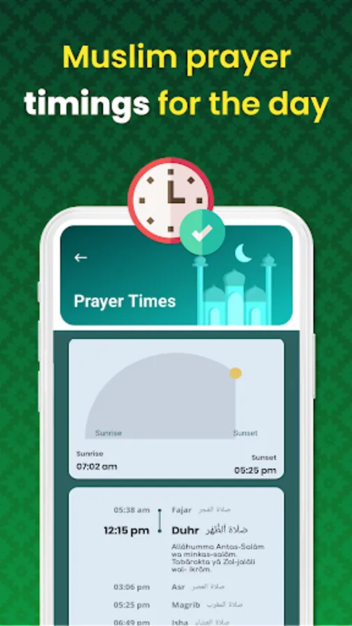 Salat, which is one of the five pillars of Islam is very important to Muslims. Muslim Hub: Quran Prayer Times respects this ritual of praying five times a day in a set form. These Muslim prayer times depend on the position of the sun from sunlight to sunset.