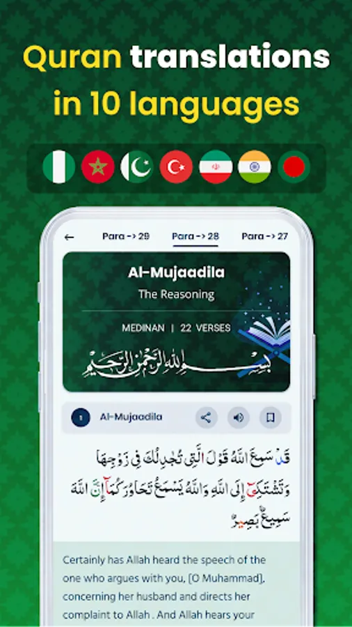 This Muslim hub: Quran Prayer Times app offers translation in 10 languages, which means people can read the verses in a language that they are most comfortable. These include Bengali (Bayaan Foundation), Bengali (Fozlur Rahman), Bengali (Majibur Rahman), English (Abdul Haleem), English (Sahih International), Hindi (Farooq/Nadwi), Indonesian (Bahasa), Turkish (Diyanet Isleri), and Urdu (Muhammad Junagarhi).