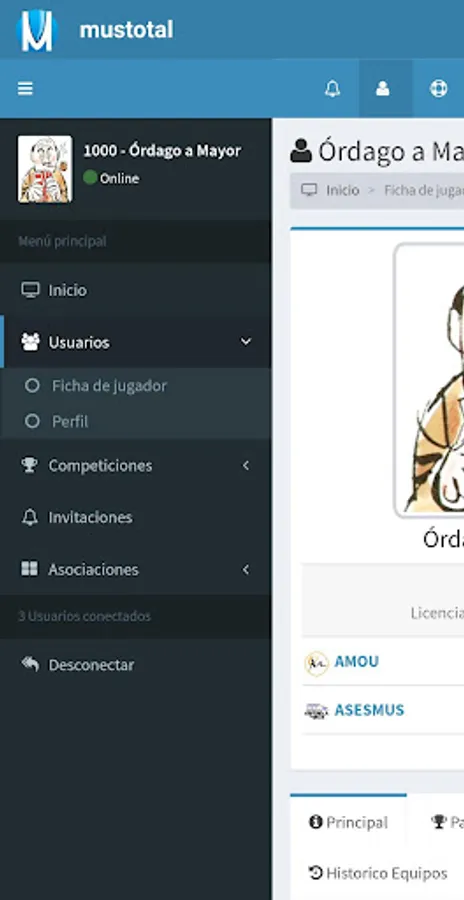 · User card: Player license number, data, links, associations, competition history, medal winners.