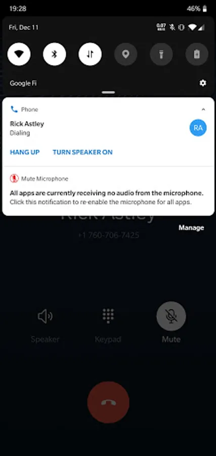 "Mute Microphone" does what it says FOR ALL OF ANDROID and mutes the mic for all apps at once. If "Mute Microphone" is running, ANY APP that uses the microphone will not receive audio, INCLUDING THE PHONE APP. It is software kill switch with no "UI" other than a notification to shut it off (and re-enable the mic).