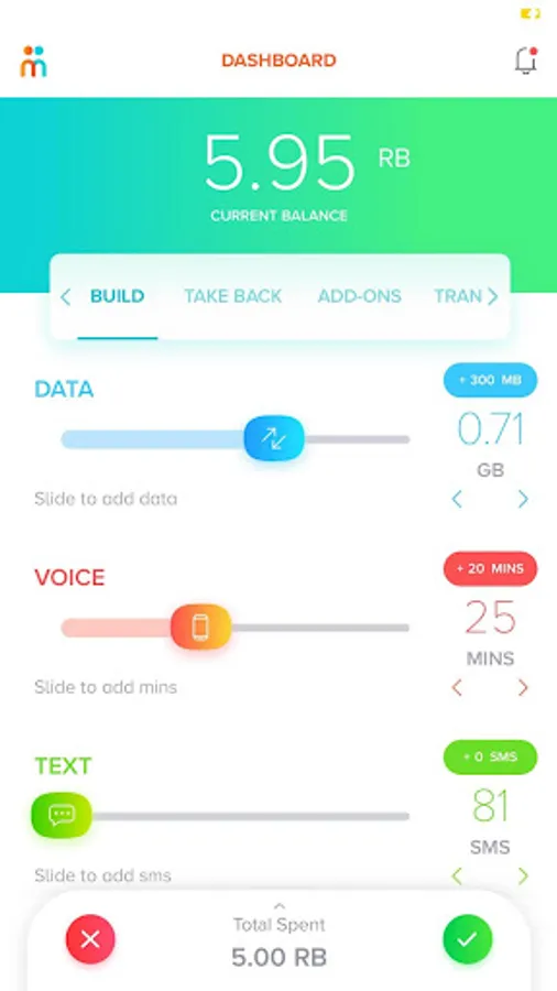 Mamen app takes the concept of “customer knows best” to a completely new level. Simply use the build feature to slide and create your mobile plan or use the Take Back feature to convert any unused data, SMS or voice minutes credited back to you. Keep a track of your usage while enjoying full flexibility. You are in control. You can even send or request balance points to your friends and grab discount offers from our lifestyle offers.
