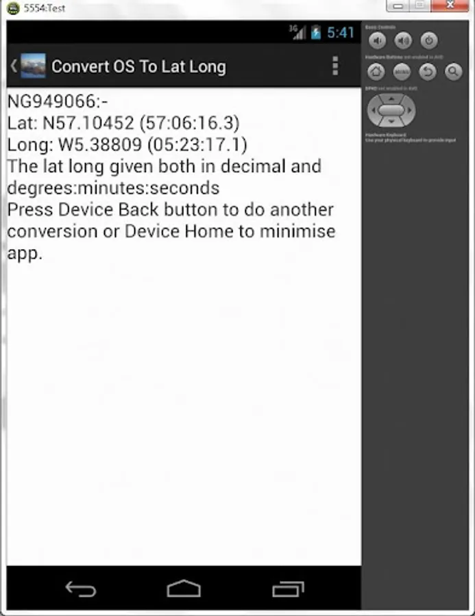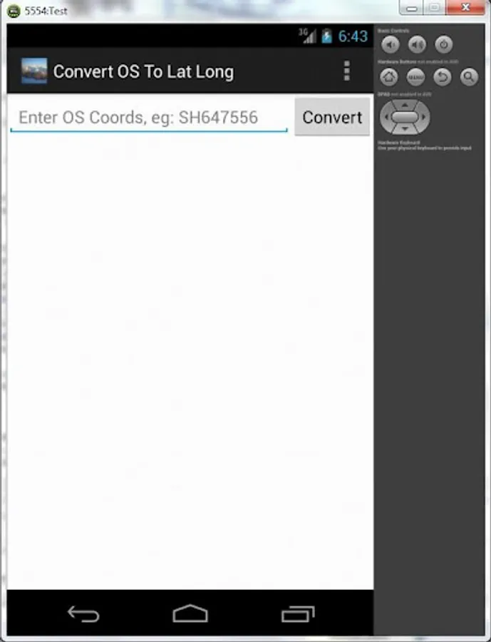 Once installed on the Android device, the app is simplicity itself to use, just key the OS Coordinates into the text box (the 2 letter prefix is not case sensitive) and press Convert. The Coordinate will then be displayed as a Lat Long. If the coordinate entered is not valid then an error message will be displayed.