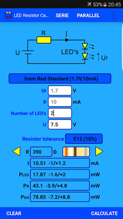 Resistor LED calculator for determining the value of the current limiting series resistor when driving a single or more series/parallel of LEDs.