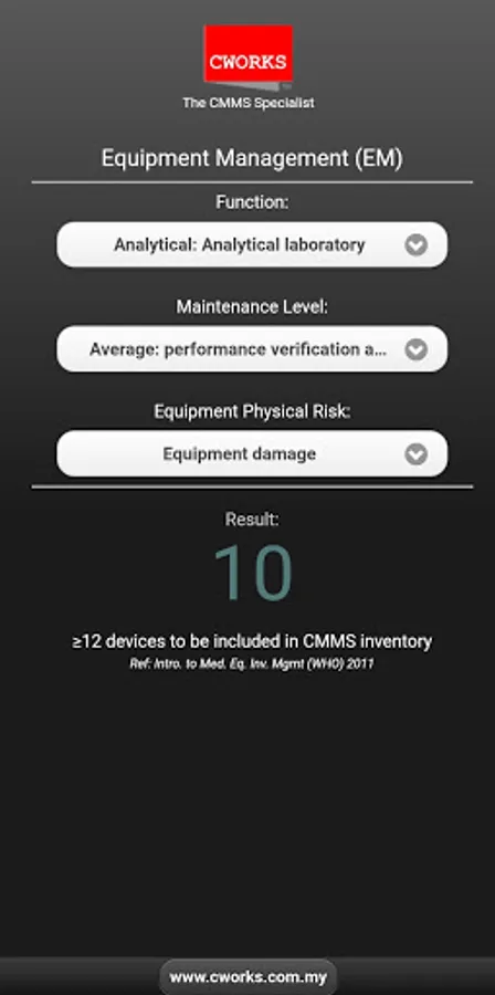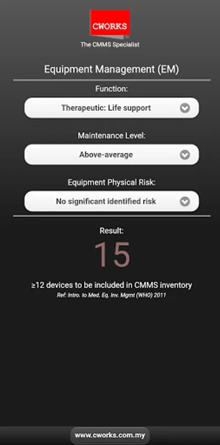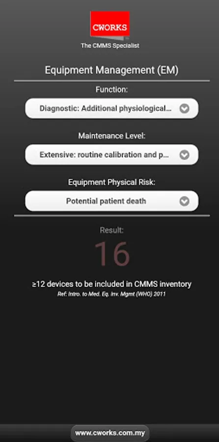 Used to identify medical equipment/ devices' criticality. According to the World Health Organization (WHO), those with EM = 12 or above needs to be included in the inventory and thoroughly maintained. The scores are based on levels of Equipment Function, Physical Risk associated with clinical applications and Maintenance Requirements.