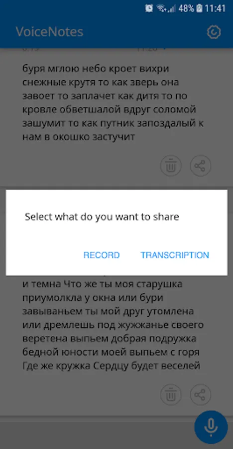 You can share transcribed text via email or any messenger.