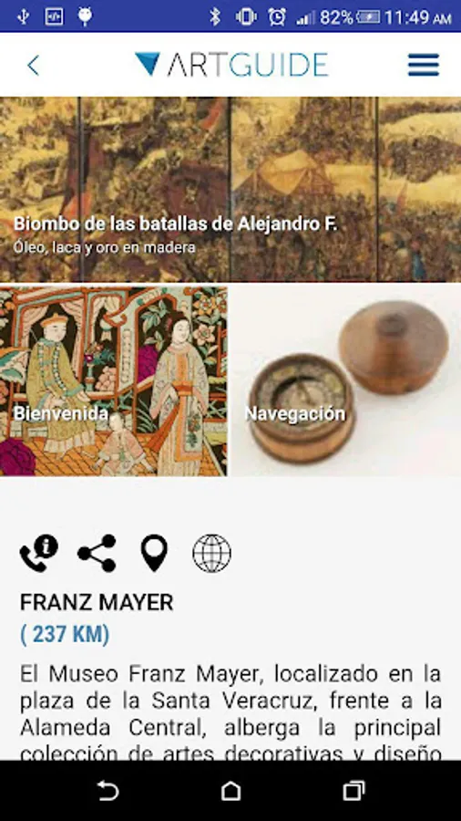 The app uses Bluetooth beacons to show visitors a museum relevant information of each work as tour the museum galleries. The information shown is a high resolution version of the work, information about the picture, about the author and a list of related works, as well as audio commentary of the work.